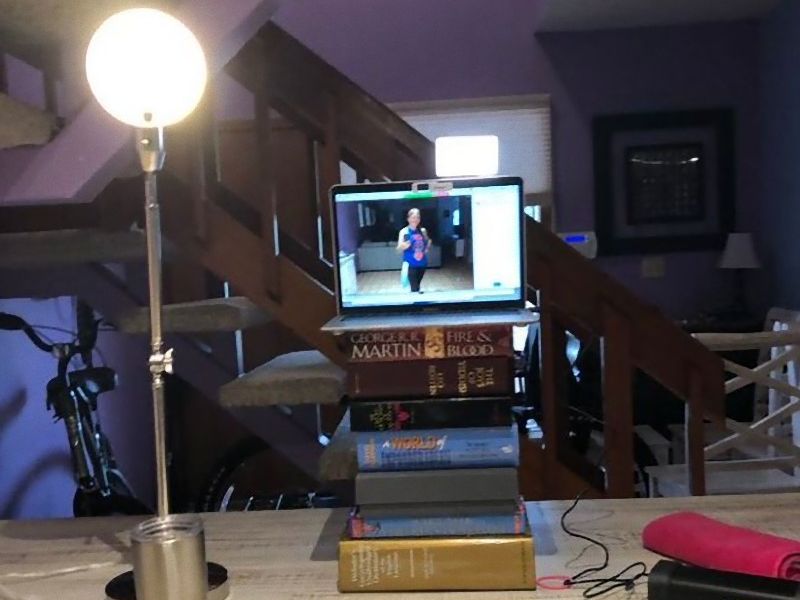 ぶ厚い本のパソコン台と、強力なライティング。