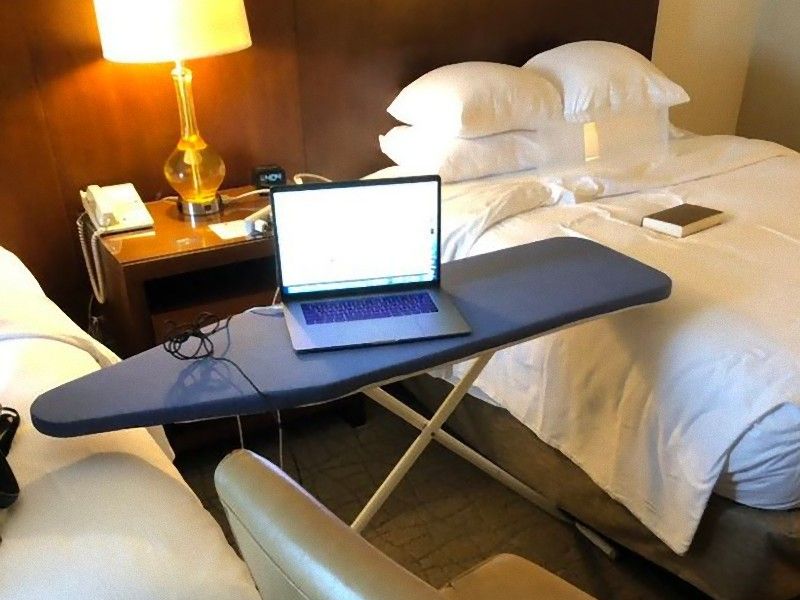 ホテルのアイロン台をデスクに。