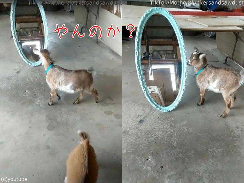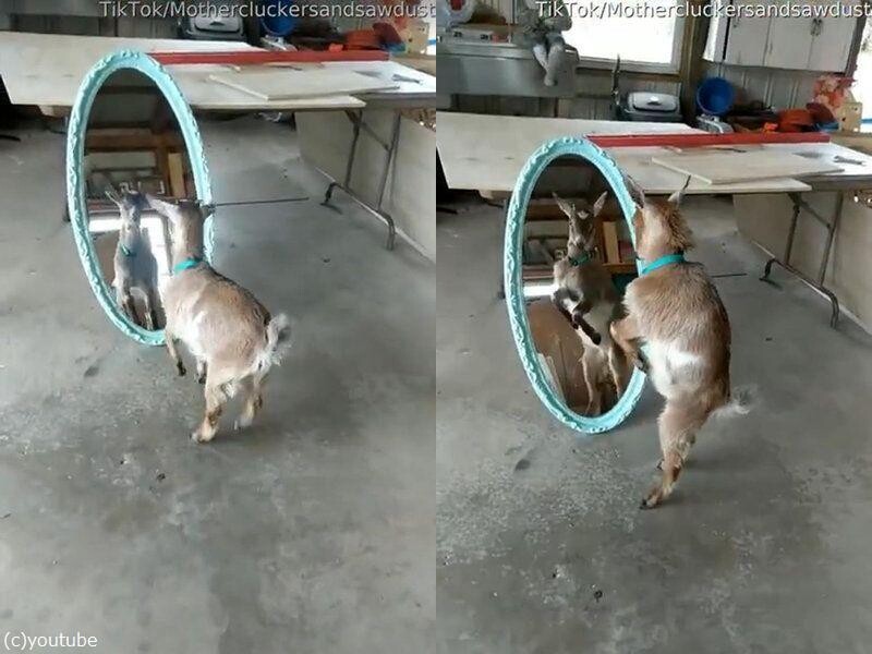 鏡の前で子ヤギが…自分を大きく見せようとする(動画)