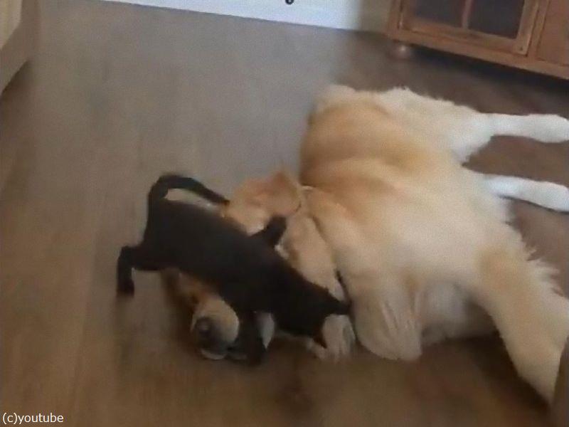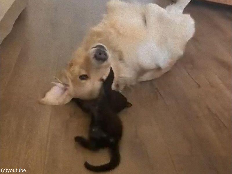 「やられたー!」猫に負けてあげる優しい犬(動画)