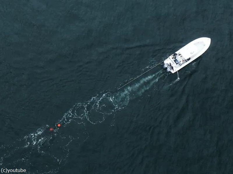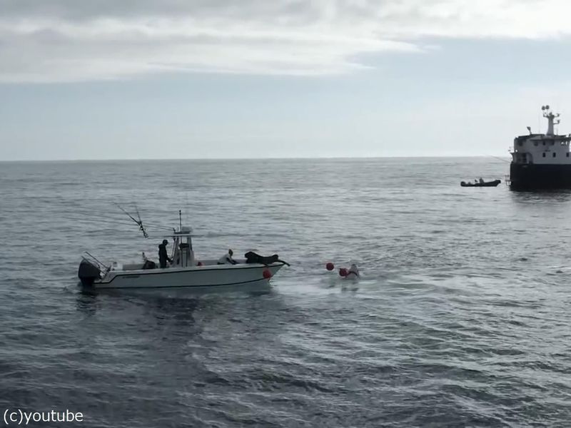 捕獲にあたったのはこんな小さなボート。映画「ジョーズ」のようなことにならないか不安になりますね……。