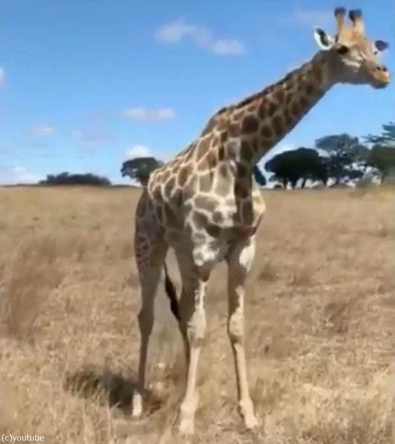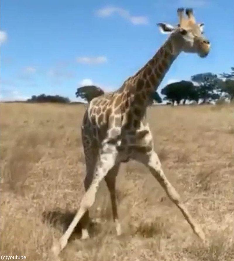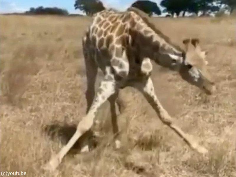 キリンが草を食べたり水を飲んだりするときは、このように長い前足を大きく開きます。
