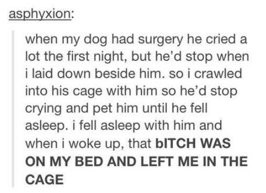 朝起きたら、犬は自分のベッドの上で寝ていて、自分はケージに取り残されていた」