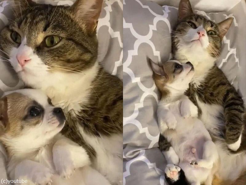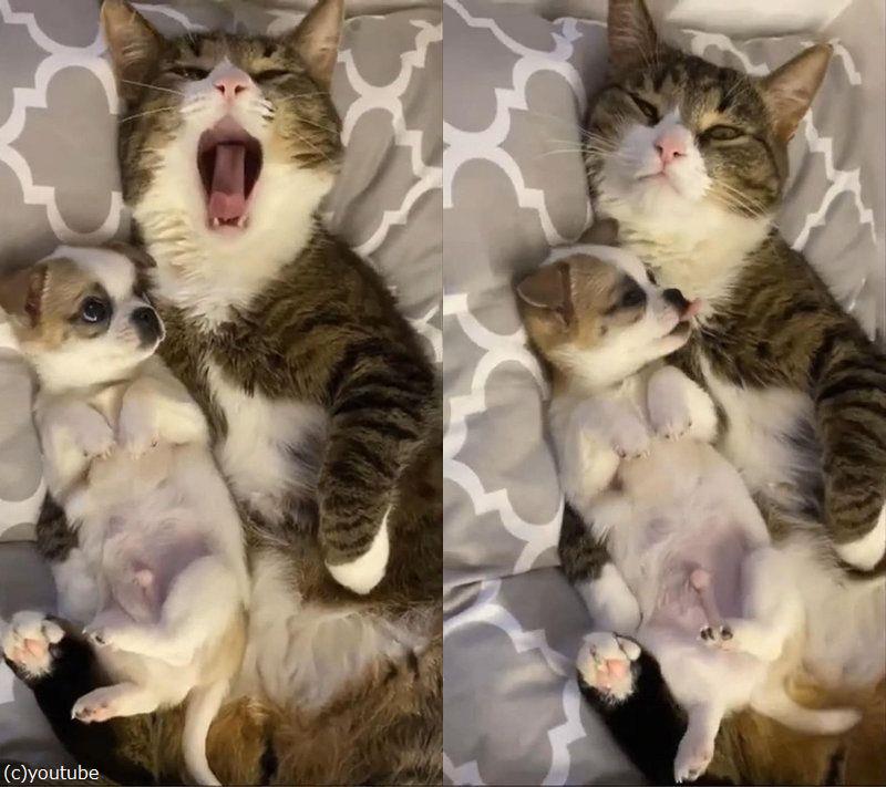 犬の赤ちゃんを優しく包み込む猫…愛情いっぱい(動画)