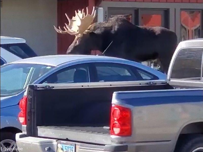 アメリカ・ワイオミング州の高齢者センターに、世界最大のシカであるヘラジカが出没。