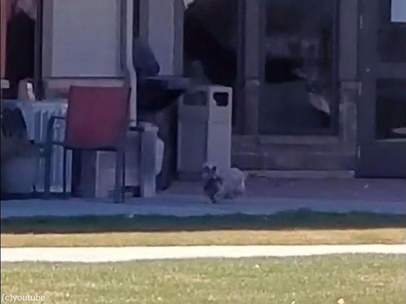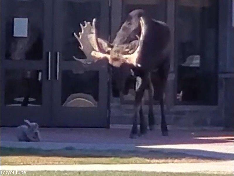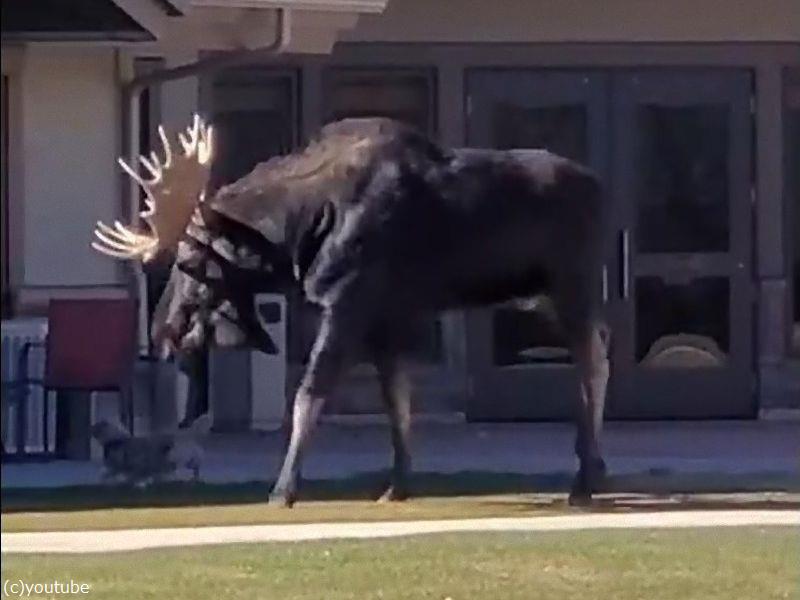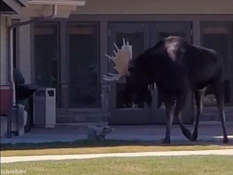 高齢者センターに巨大なヘラジカが現れた…立ち向かう小さな犬(動画)