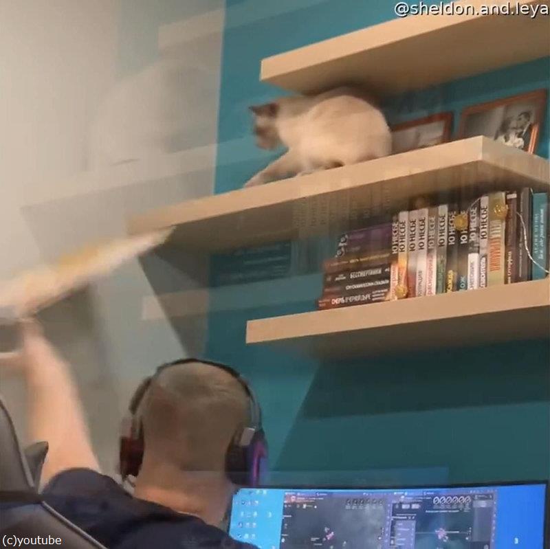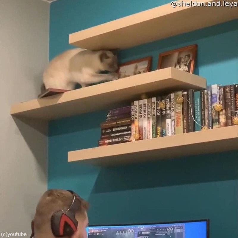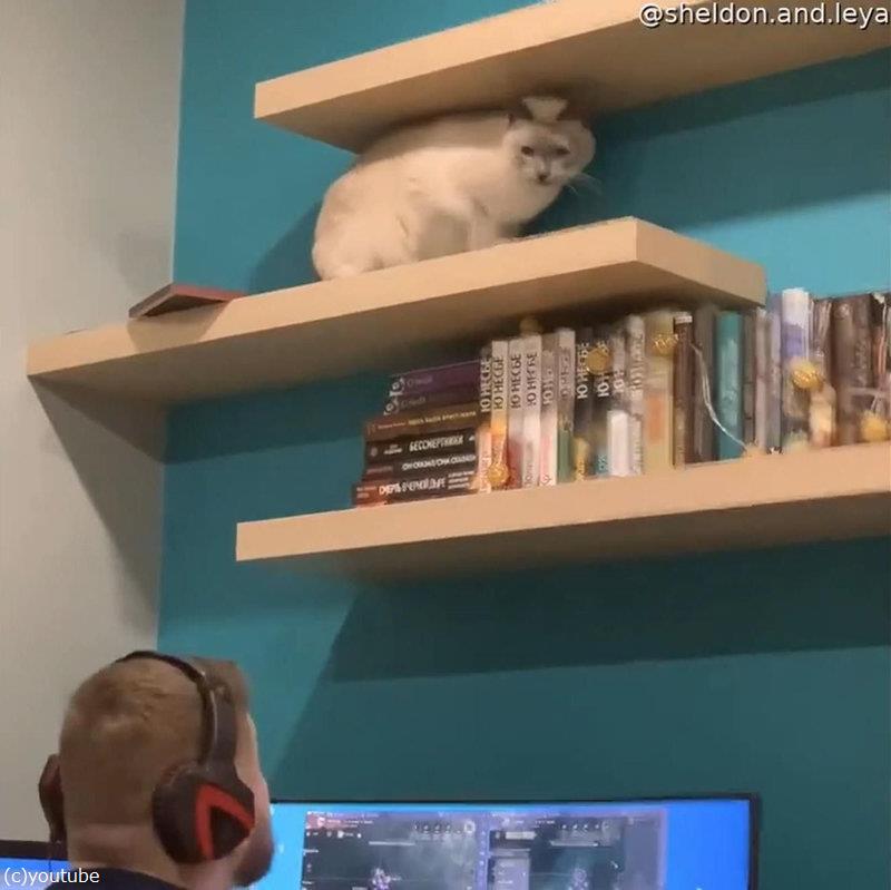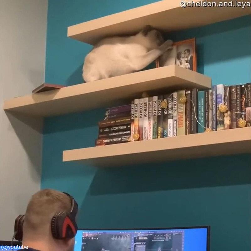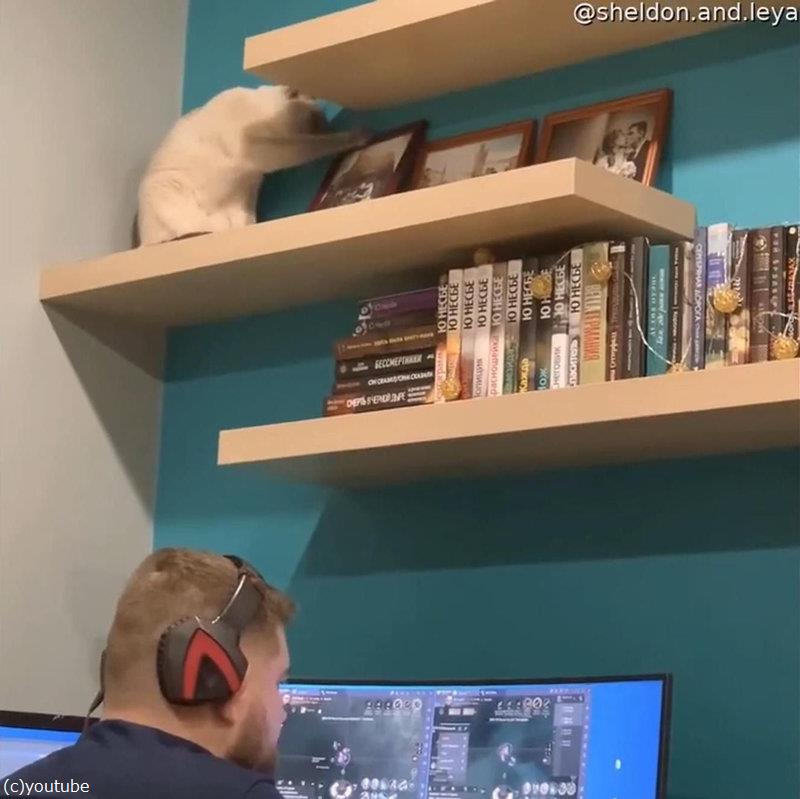 棚の上の猫、ゲームに熱中する男性の頭上でやんちゃを始める(動画)