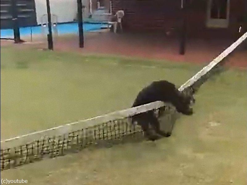 テニスコートのネットに向かって助走をする黒い犬。