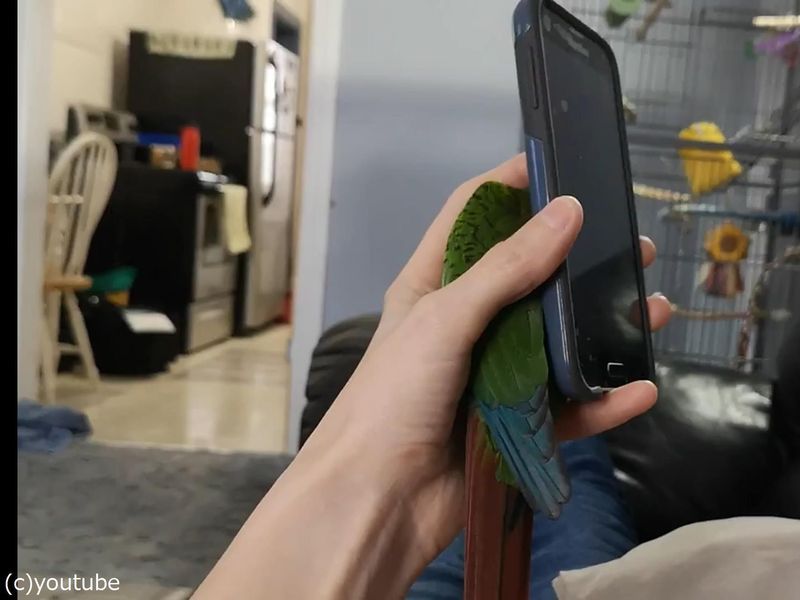 カナダで暮らすインコのカーリーは、スマホと手の間に収まるのが大好きなのだとか。