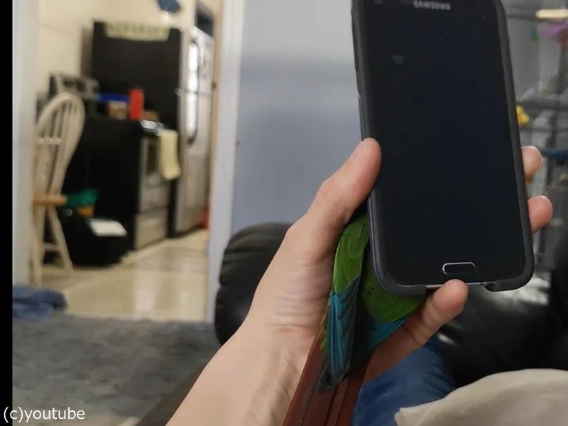 スマホと手のすき間に入ってくるインコ(動画)