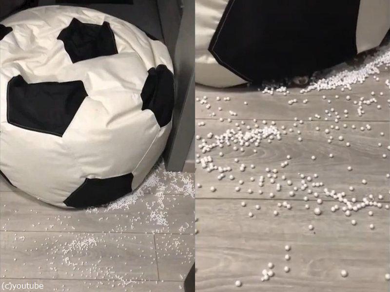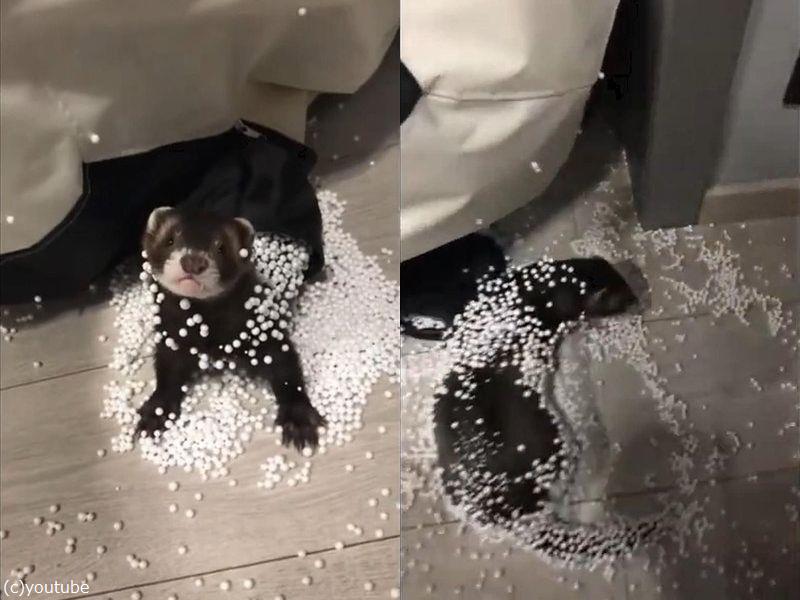 イタズラ好きのフェレット、クッションを破ってビーズまみれになる(動画)
