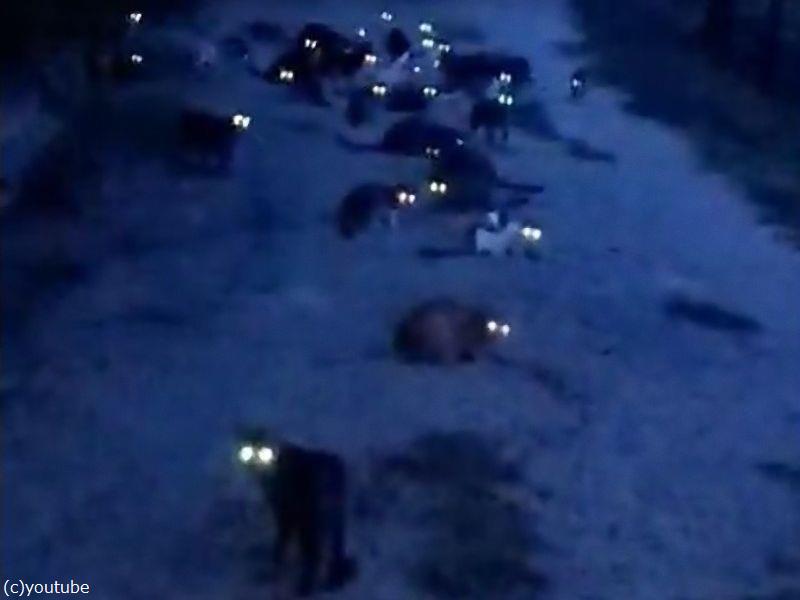暗闇で目を光らせた猫たちが一斉にこちらを向くと…壮観なことになる(動画)
