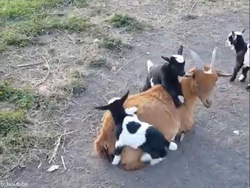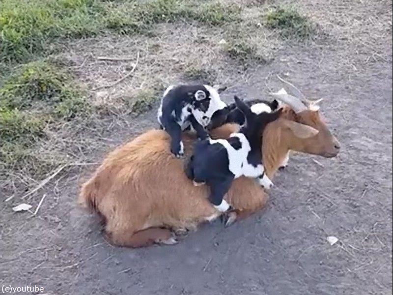 赤ちゃんヤギたちがママの背中に登ろうとするも…(動画)
