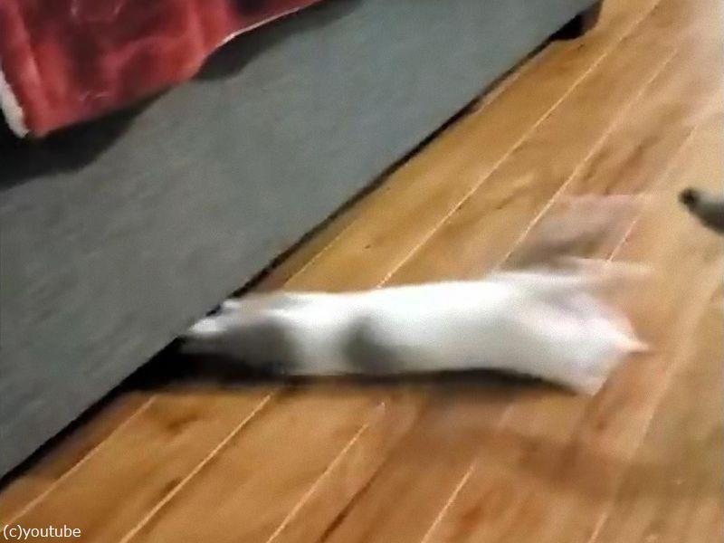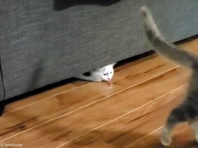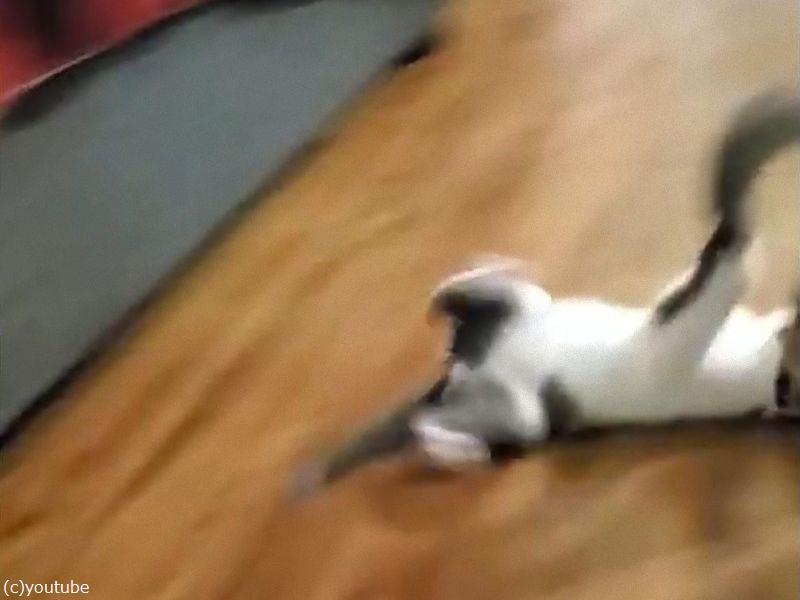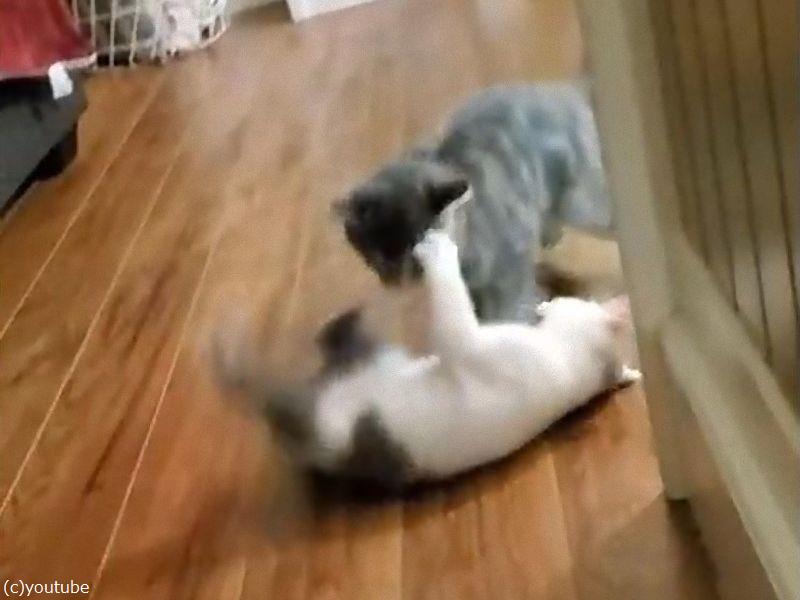 子猫、逆さにスライディングして他の猫を驚かせる(動画)