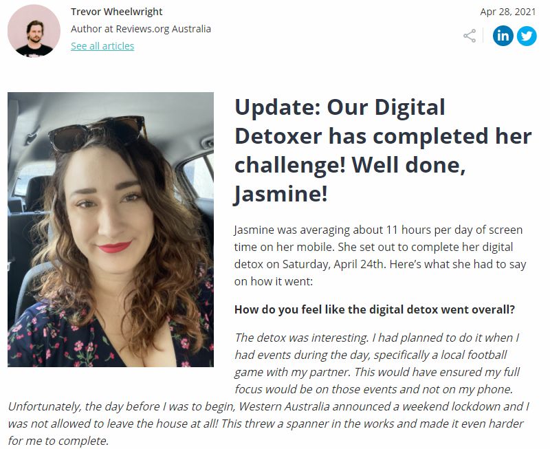 「デジタル・デトックス・チャレンジャー」に選ばれたのは西オーストラリア在住のジャスミンさん。