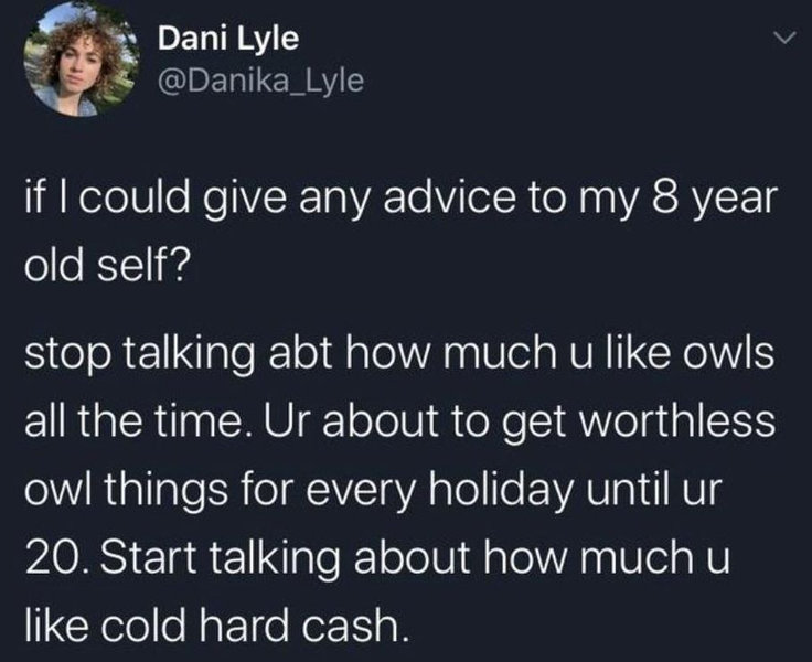 それのせいでホリデーが来るたびに、つまらない小さなフクロウのグッズを20歳になるまで贈られることになる。