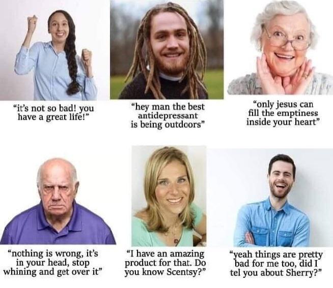 若い女性「そんな悪くないわよ! いい人生だと思うわ!」 若い男性「一番いい抗うつ剤は、外に出ることだぞ」 高齢女性「イエス様は、あなたの空虚な心を埋めてくださいますよ」 高齢男性「何もおかしなことはない、それは自分の頭の中だけだ。弱音を吐かないで乗り越えろ」 熟年女性「それに効くすばらしい製品があるわ。Scentsy(マルチ商法の会社)を知ってるかしら?」 熟年男性「そうだよ、オレも結構大変なんだ。シェリーについて話したっけ?」