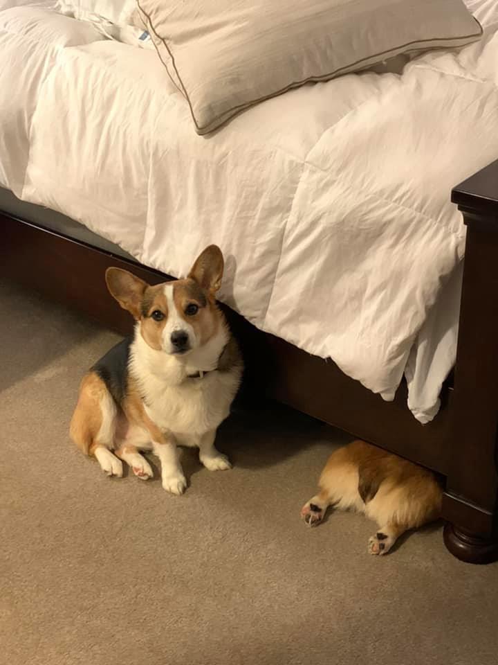 「うちの犬は、まだ上手な隠れ方を知らない…」頭隠して尻隠さずのコーギー