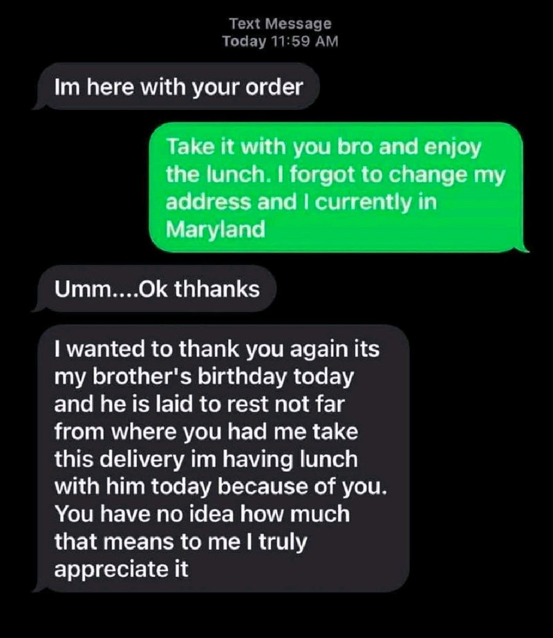 自分「もらっておいてください、そしてランチを楽しんでください。住所変更を忘れてしまい、現在メリーランド州にいるのです」