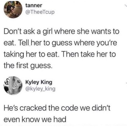 「彼女にどこで食べたいか聞いてはいけない。彼女に『どこに連れていくと思う?』と言ってみよう。そして彼女の最初の答えのところに連れていくんだ」