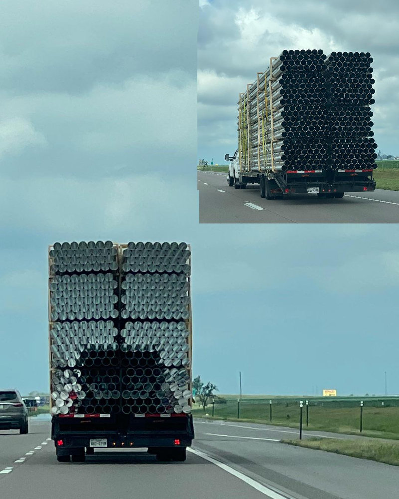 なんとこの2つの写真、アングルが変わっただけで、まったく同じパイプが積まれたトラックなのだとか。