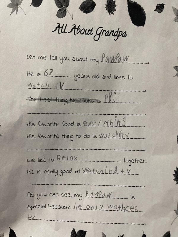 穴埋めの課題で、おじいちゃんのことをパウパウと呼んでいるようです。どうやら彼にとって、テレビばかり見ている存在なのはわかりました。
