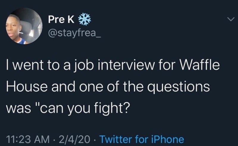 「ワッフルハウスの面接に行ったんだが、質問の1つは『戦えますか?』だった。」