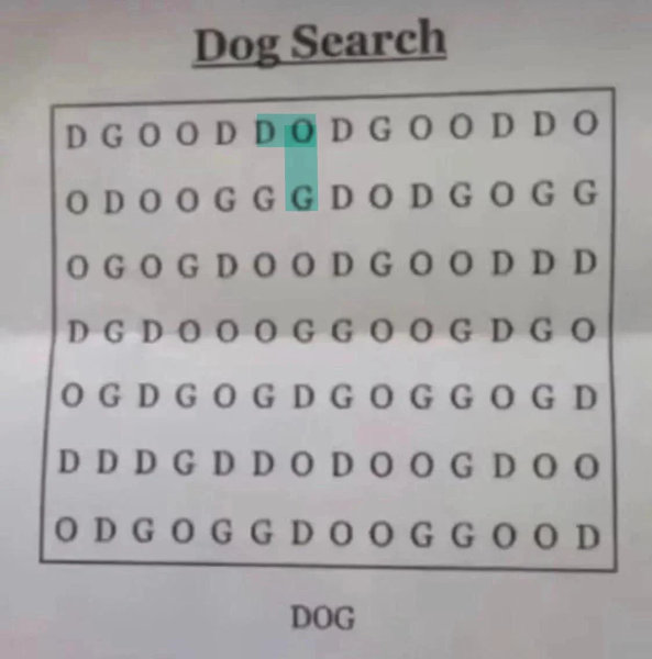 文字数やマス目が多いほど難しくなるのが通常ですが、わずか3文字「D」「O」「G」の中から「DOG」を探す問題が、意外なほど難しいと評判を呼んでいました。