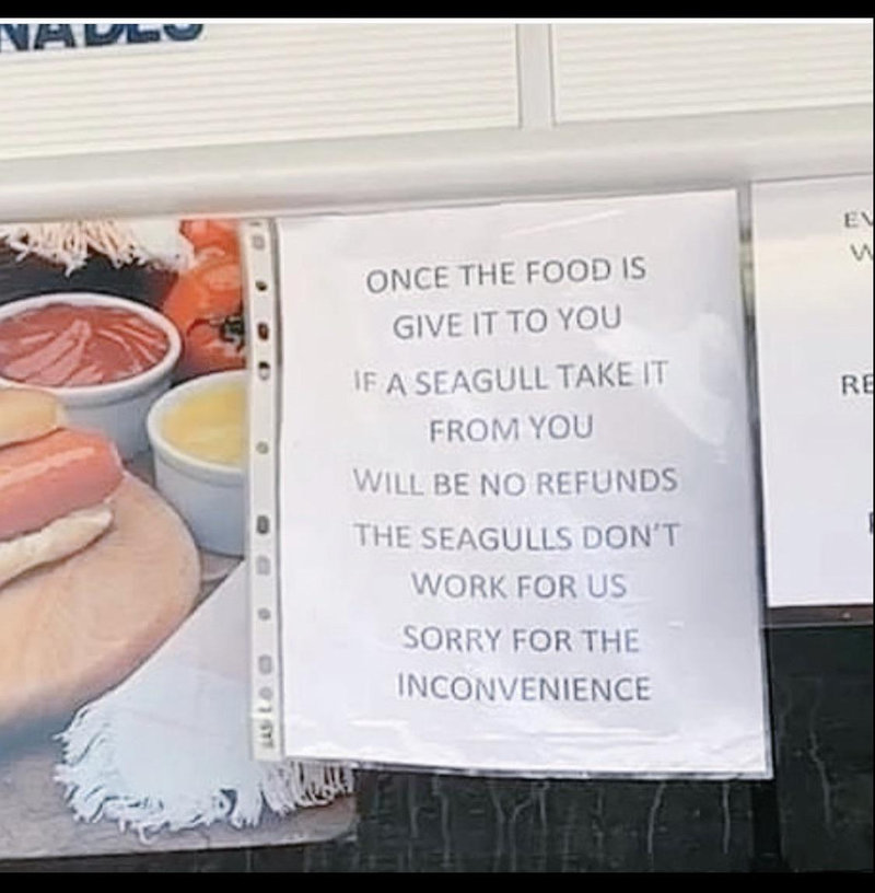 ↑うちの店では、客が目の前で食べた後にカモメに盗られたと言っても、それでも取り替えなきゃいけないと言われた。16歳のときに3週間しか働かなかったのでその必要はなかったけど、ずっと覚えていた。