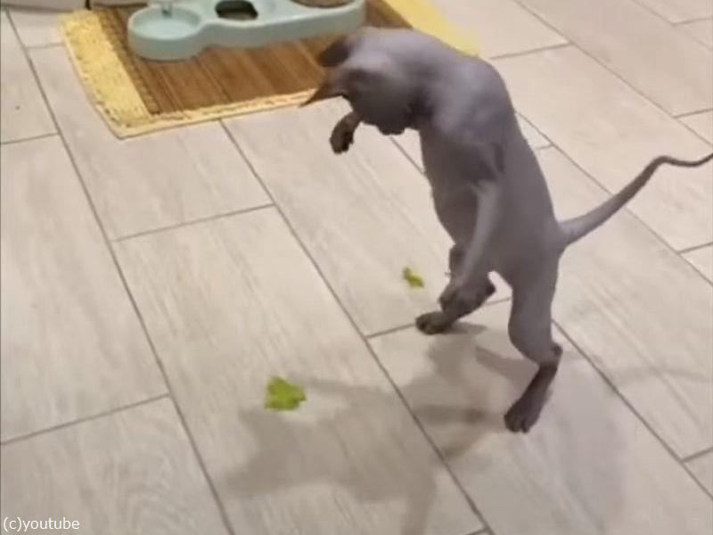 気の小さな猫が…レタスの切れ端に対して大きく出る(動画)