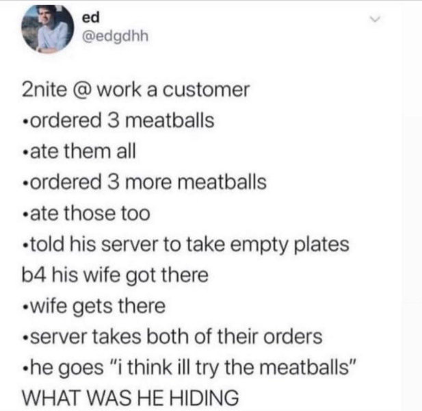 店員「ミートボールを注文する客が気になる…彼は妻に何を隠してるのだろう?」