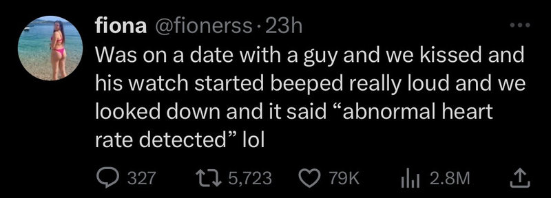 「デート中にキスをしたんだけど、彼の腕時計がすごく大きな音で鳴り始めて、私たちが下を見たら『異常心拍数検出』って表示されていた(笑)」