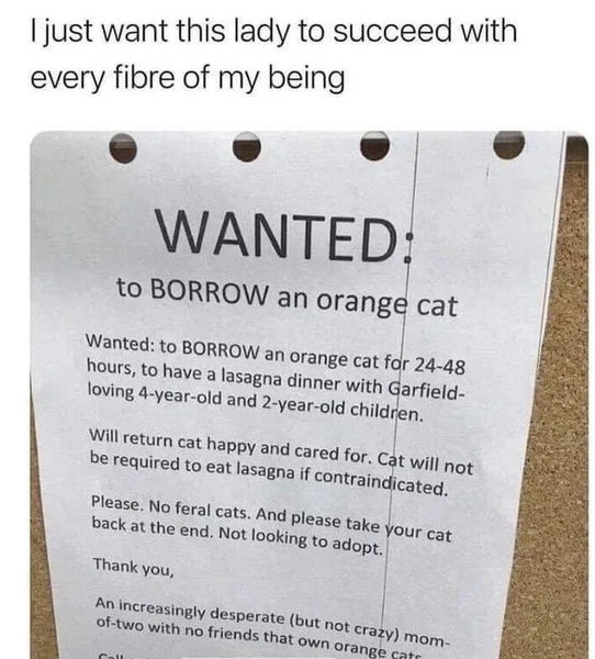 なるほど、1〜2日ほどオレンジ猫を貸りたい2児の母の要望ですが、見つかるのでしょうか。