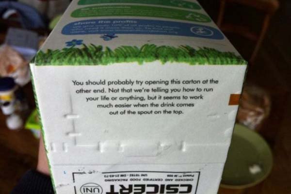 「このパックは反対側から開封した方が良いのではないでしょうか。いえ、何もお客様のやり方に口出ししようなんてつもりはないんです。単に飲み物は上の注ぎ口出てきた方が、ずっとうまくいくと思うのです」