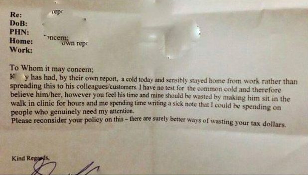 普通の風邪の症状で検査など行わないので、私は本人を信用していますが、しかしながらあなたは何時間も彼を外来診療で待たせ、私に病気の診断書を書かせることで、彼の時間も私の時間も無駄にすべきだと考えておられるようです。私を本当に必要とする人のために時間を使うことが出来るのにです。この件に関する方針を再考してください。