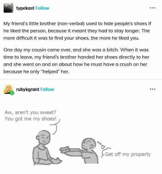ある日いとこが家に来た。彼女はビッチだった。帰る時間になると、友人の弟は彼女の靴を直接手渡し、彼女は「手伝って」くれたから『きっと私に気があるのよ』と延々と言い続けた」