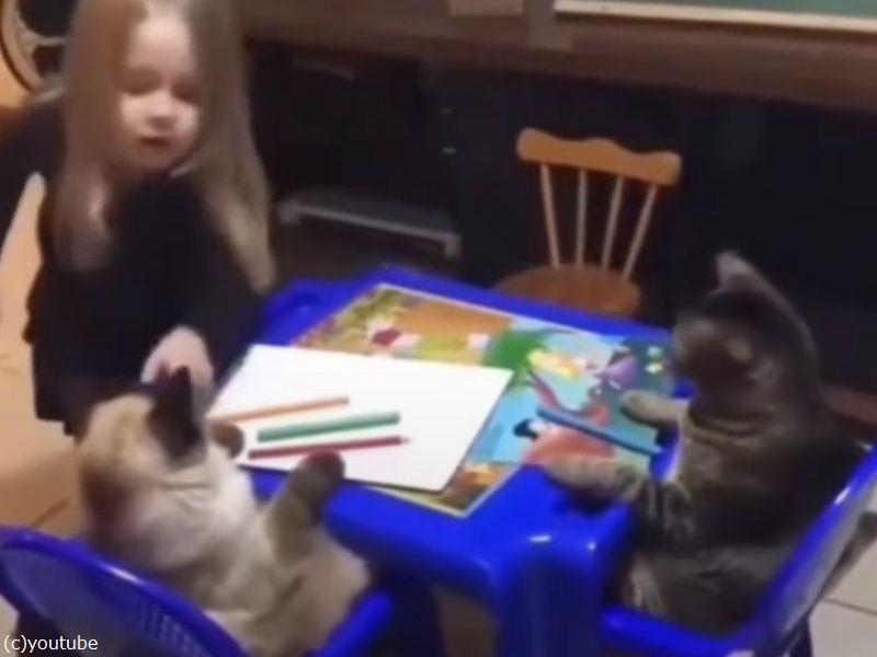 女の子の教師ぶりも板についていますが、おとなしくイスに座っている猫たちもえらい……。