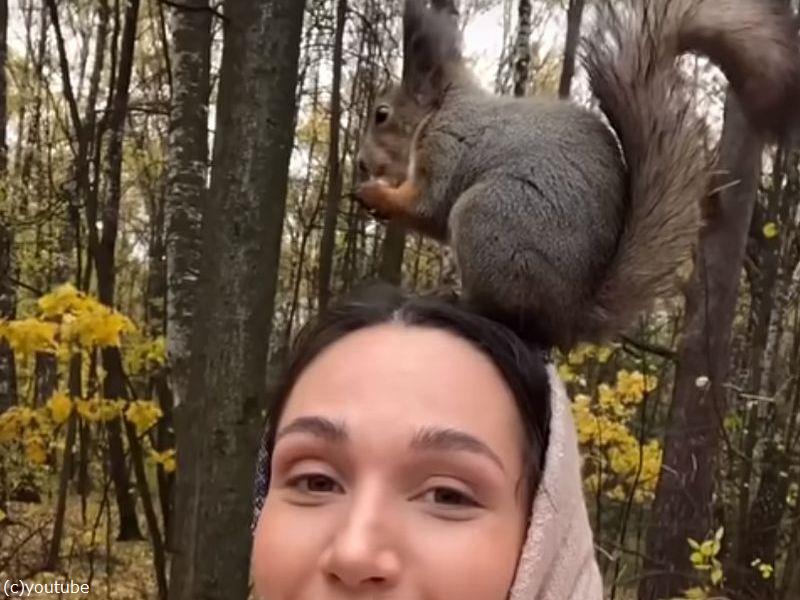 「まるで白雪姫…」女性の頭の上でエサを食べる野生のリス(動画)