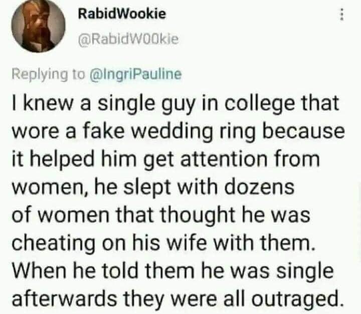大学時代に偽の結婚指輪をしていた独身男性がいたそうで、あたかも既婚者のように振る舞っていたとのこと。