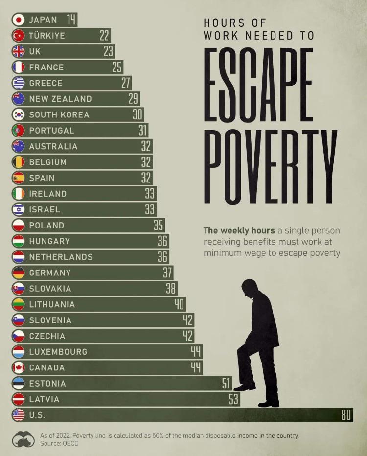 貧困線は可処分所得の中央値の50%で計算されており、アメリカが最長で週80時間(実質的にフルタイムの仕事2つ分)、他国と大きな差があることが浮き彫りになっていました。