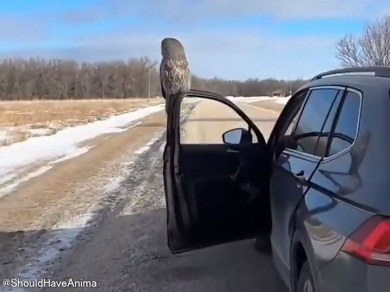 車を降りたらドアに立派な野生のフクロウが止まった…目が合った瞬間