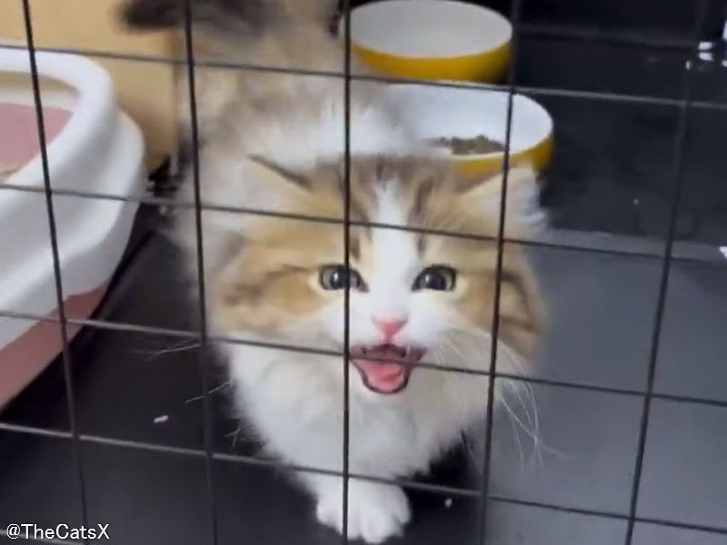 ケージを通り抜けようとした猫が…無理だと確信した瞬間の顔