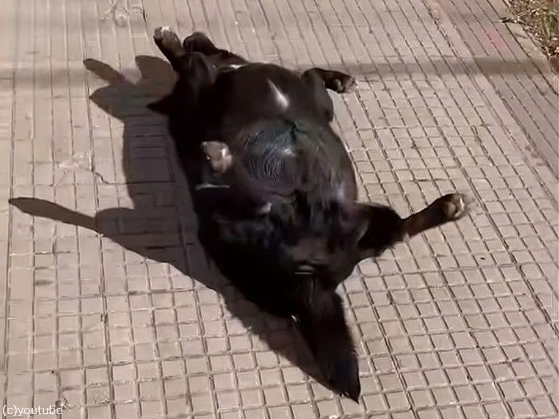 歩道でひっくり返っていた犬に近づいてみると…ぐっすり熟睡していた(動画)