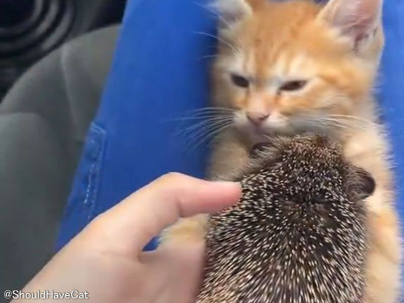 「子猫の胸元にハリネズミを近づけると何が起こる?」→キュートな結果に