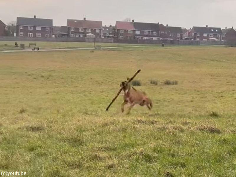 長い棒切れを振り回す犬「棒術の達人!?」(動画)