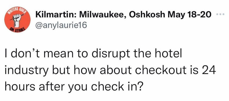 「ホテル業界を混乱させるつもりはないが、チェックアウトの時間をチェックインから24時間後にするのはどうだろうか?」