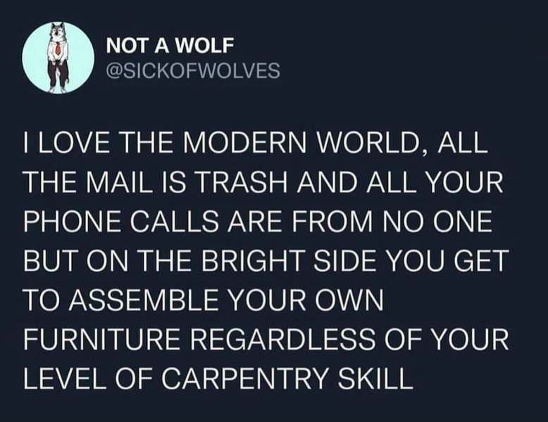 「現代の世界はサイコー! すべてのメールはゴミで、すべての電話は知らない人からばかり。 だけど、明るい面を見れば、大工のスキルに関係なく 自分で家具を組み立てることができる」