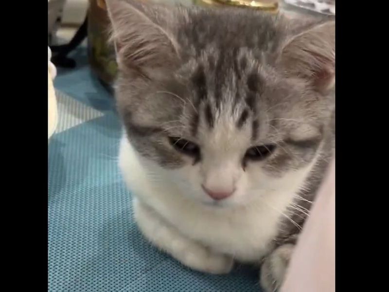 気を失うように眠りに落ち、地面に頭をぶつけてしまう子猫。