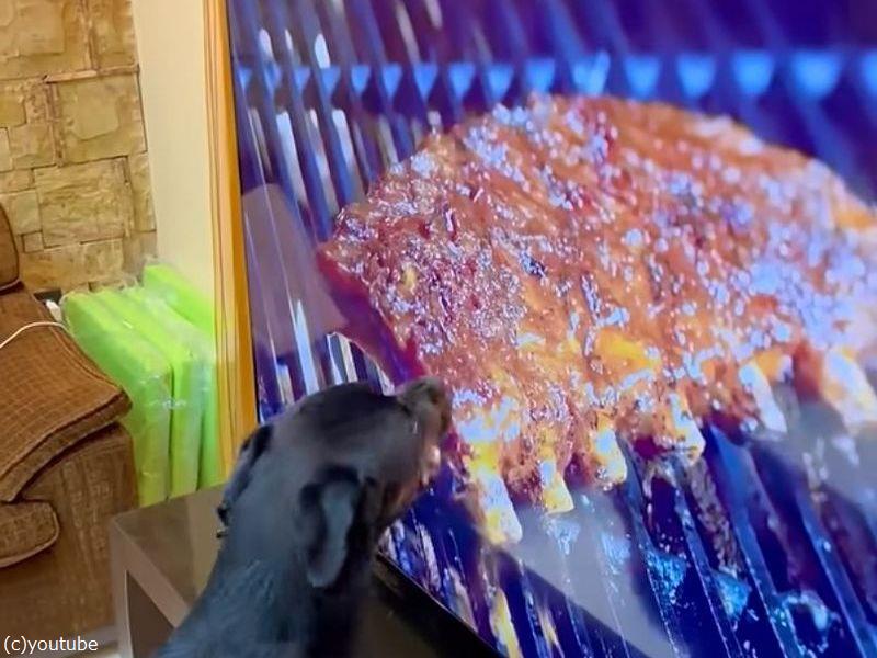 「犬としてそれはどうなの?」テレビに映る特大のお肉に誘惑される(動画)
