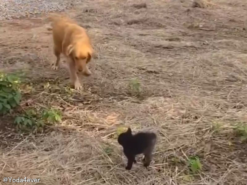 おびえる子猫と仲良くなりたいゴールデンレトリバーが取った行動